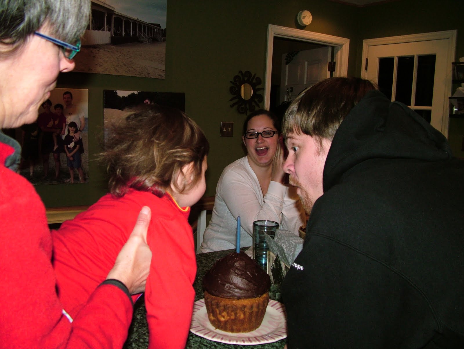 Even though the chicken wasn't a success, it was still tasty and we still had fun. The Edwards came over to celebrate too. I made an almond pound cake with a dutch chocolate ice cream center and dark chocolate frosting (per Dave's request). Lincoln LOVES to sing Happy Birthday and help blow out candles. Rachel topped my cake with Dave's present: Dr. Pepper and Double Stuffed Oreos!